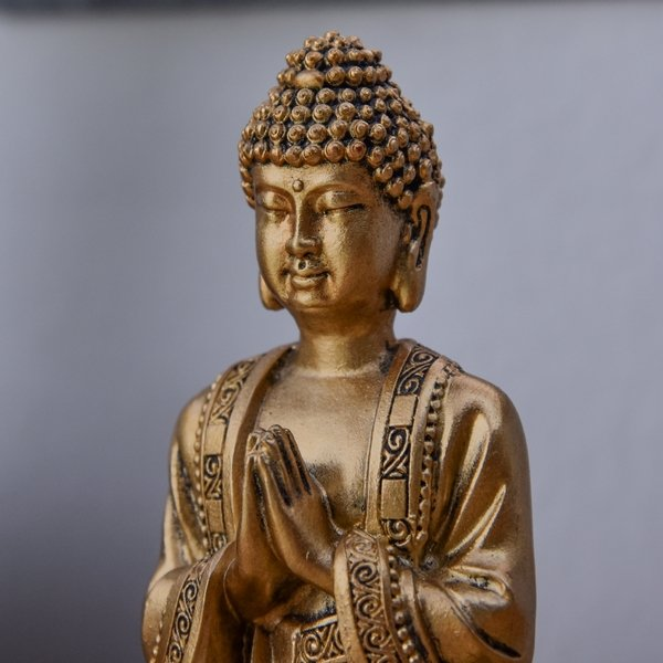 Dit beeld stelt een Boeddha voor in meditatie. De zorg voor elk detail en de gouden verf met een gepatineerd effect geven het veel karakter.