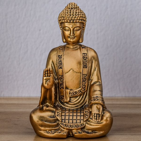 Dit beeld stelt een gouden Boeddha voor in een meditatiehouding. De zorg voor elk detail en de gouden afwerking geven het veel karakter.